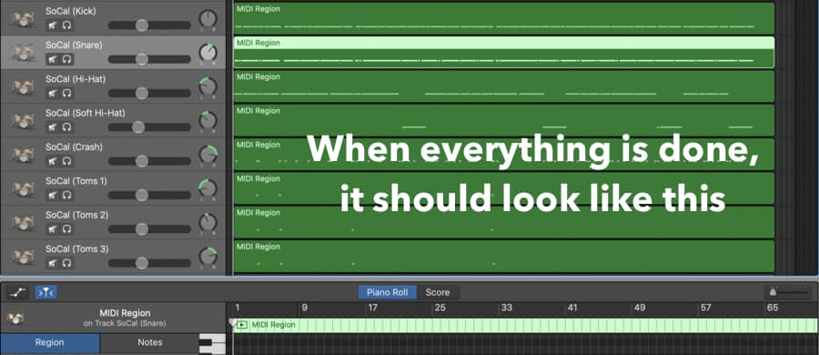 In order to mix the drums properly, you want each part of the kit to be in a different track region, including the hi-hats, each tom (tom 1, tom 2, and tom 3), the snare, the kick, the crash, and so on and so forth.
